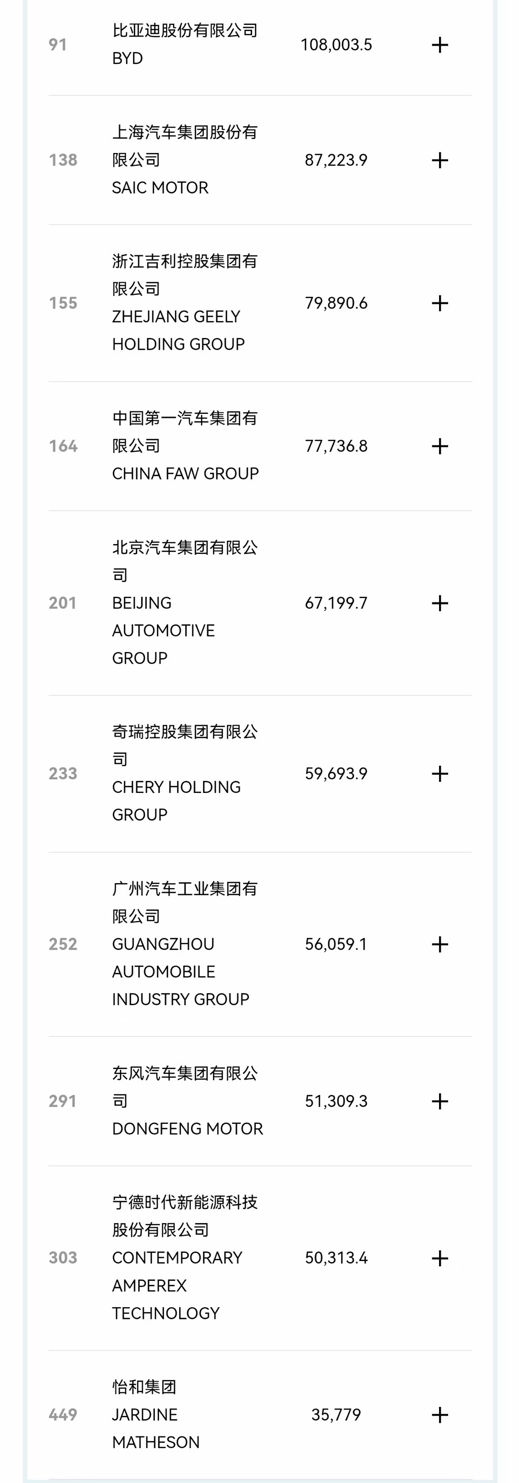 按榜单名次,中国汽车行业10家企业分别为比亚迪、上汽、吉利、一汽、北汽、奇瑞、广汽、东风、宁德时代、怡和集团,其中比亚迪首次进入榜单前100名,超越了位居106名的特斯拉。